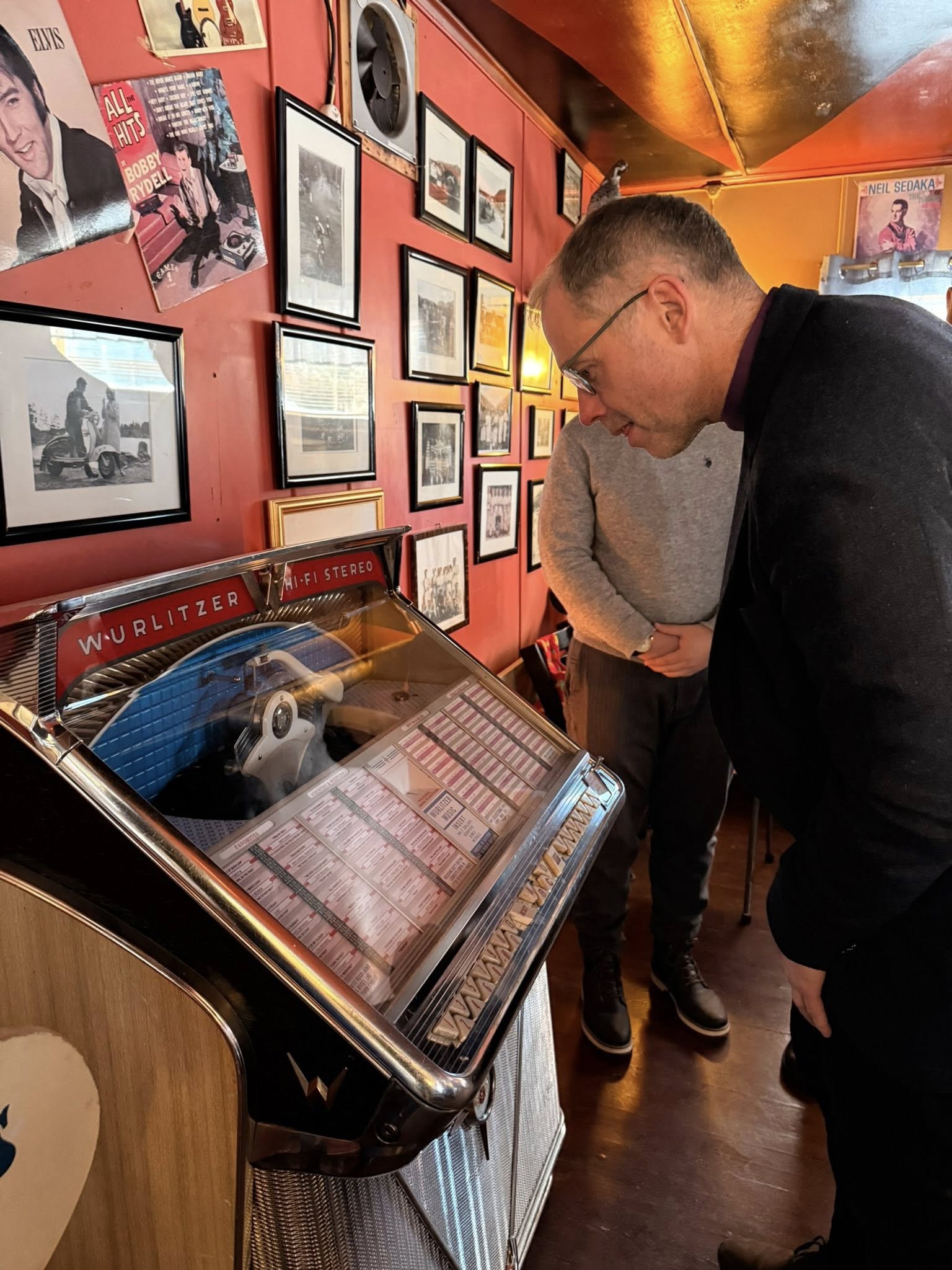 Biskopen tester jukebox'n i 50-tallskafeen Glopheim kafe. Foto: Thomas Tinglum.