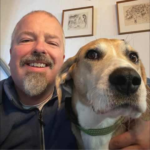 Hunden Solan er ein dunker, ei hunderase som er mykje brukt på harejakt. Men Solan er ingen jakthund. Han er ikkje interessert. Foto: Privat.