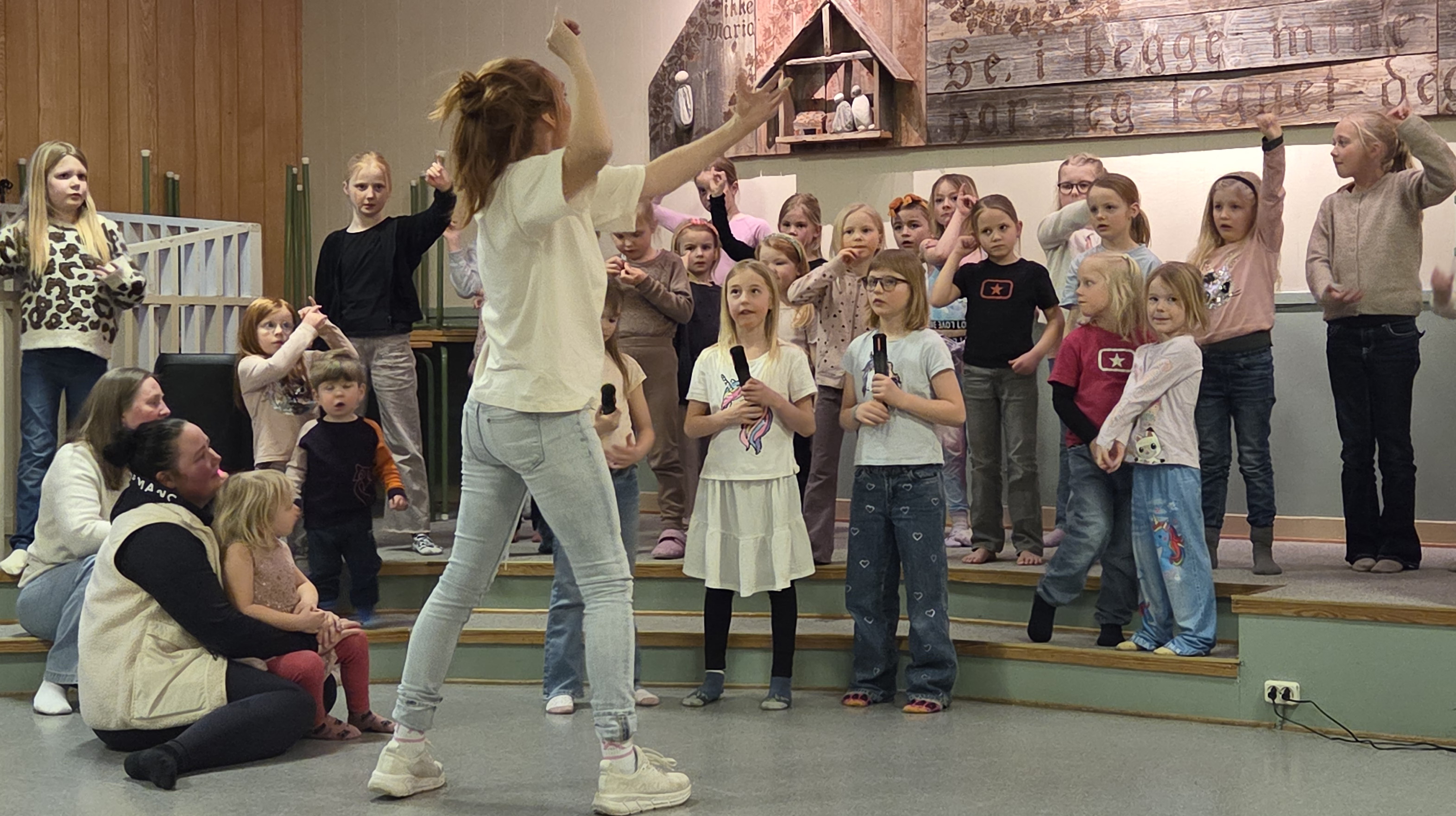 Dirigent Eldrid Fagerli Susort (med ryggen til) leder an i Soul Kids-øvelsen på Svorkmo misjonshus (Foto: Herborg Finnset)