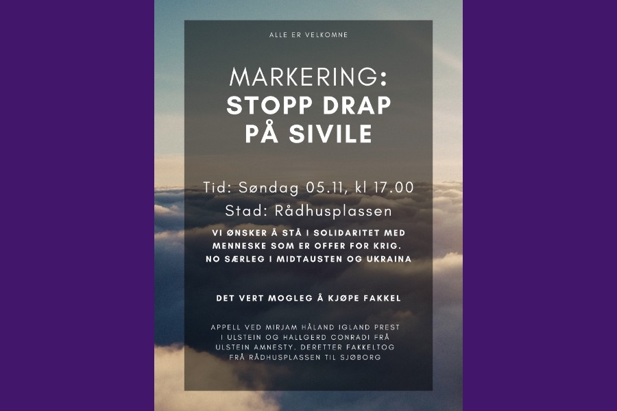 3.11.2023Stopp drap på sivile! Appell på rådhustrappa og fakkeltog etterpå. Søndag, 5.11. kl. 17:00