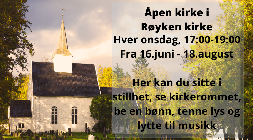 19.5.2021Fra 16.juni til 18. august holder vi Røyken kirke åpen en ettermiddag i uka.
