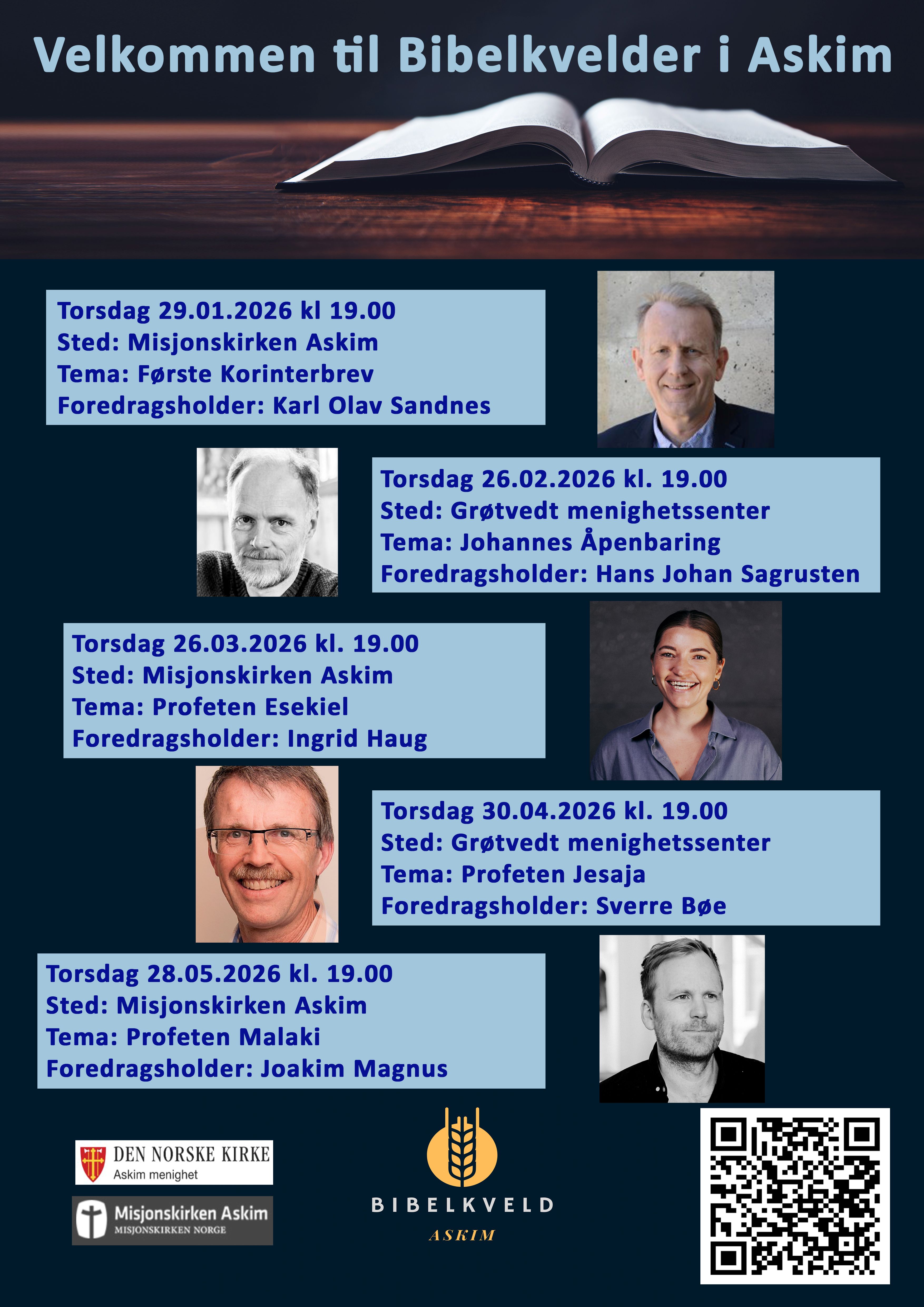 Våren 2026 er det Bibelkveld siste torsdag i måneden kl. 19.00. Det bytter på å være på Grøtvedt menighetssenter og Misjonskirken Askim.
