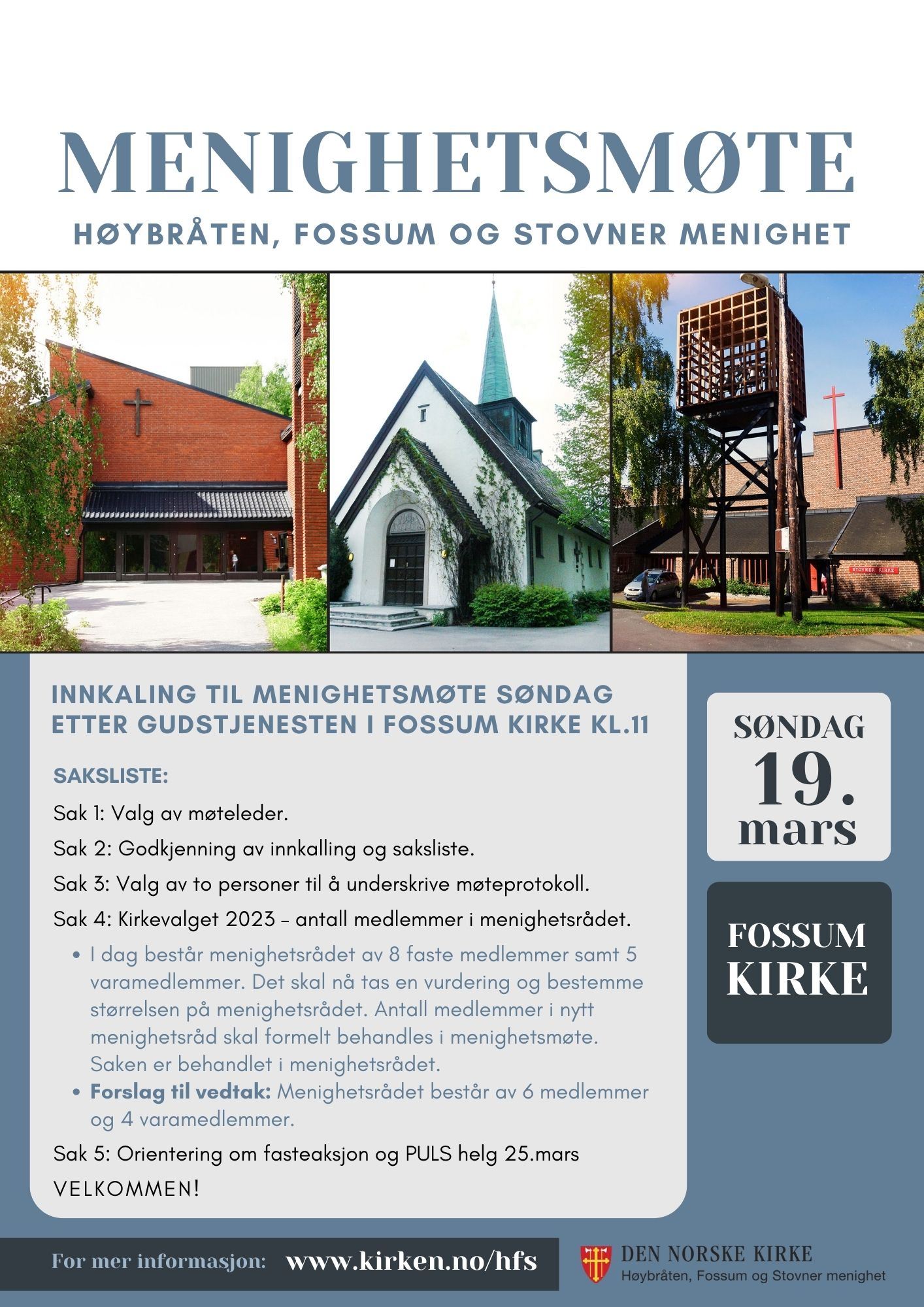 27.2.2023Velkommen til menighetsmøte søndag 19.03 etter gudstjenesten i Fossum kirke! Les sakslisten under.
