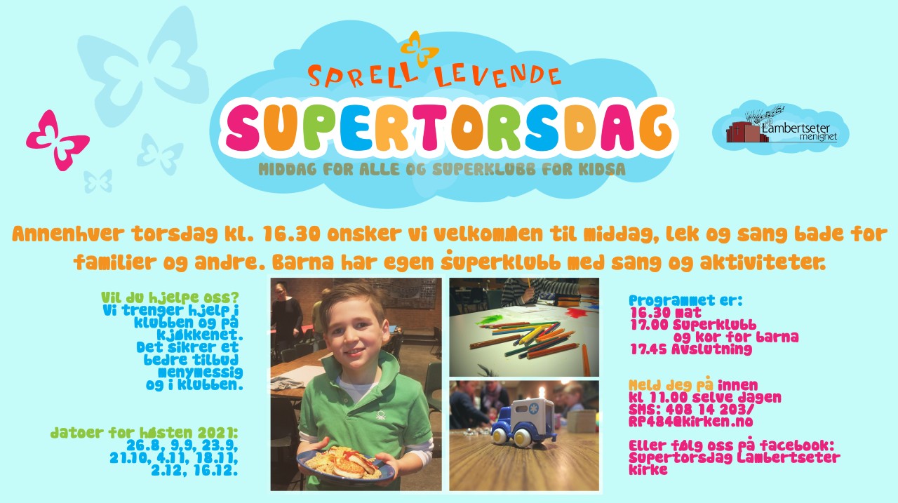 5.2.2022Supertorsdag kan endelig starte opp igjen. Bli med på middag for alle og aktiviteter for barn!