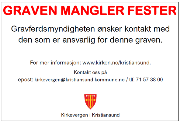 - Festeavgiften er ikke betalt og fester er ukjent eller vi får ikke kontakt med vedkommende. Vi ønsker kontakt for å få avtalt om graven skal videreføres eller slettes. Hvis vi ikke får kontakt innen det har gått 6 måneder etter at vi satte på lappen blir graven slettet. 6 måneder etter sletting faller graven graferdsmyndighetene, jfr gravferdsforskriften § 6.