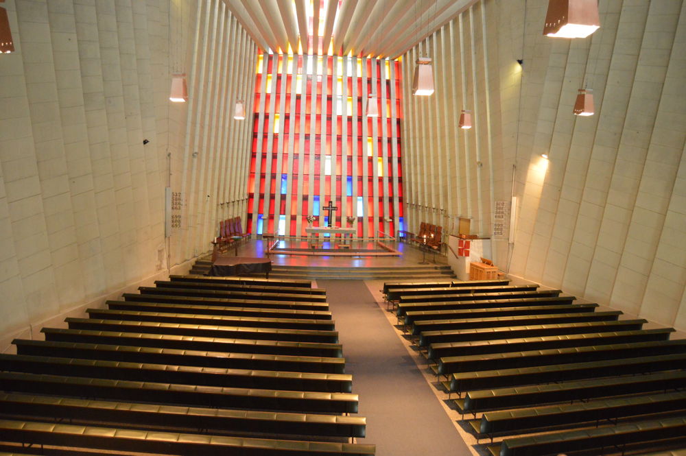 Kirkerommet er altså vifteformet, og korområdet er som et stort podium. Det står et krusifiks på alteret (utformet av Gunnar S. Gundersen), men det store blikkfanget er fondveggen med glassmaleriene (også av Gundersen). Disse er skildret på denne nettsiden.