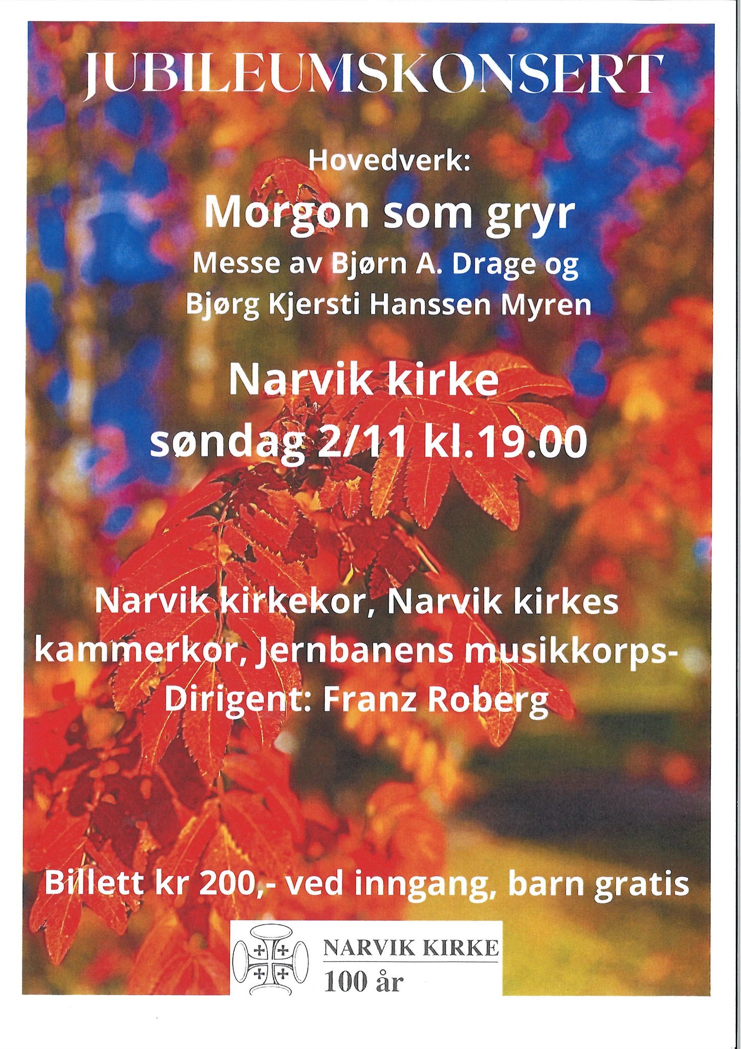 I forbindelse med Narvik kirkes 100-årsjubileum har tre aktører slått seg sammen for å markere dette jubiléet med en egen jubileumskonsert på Allehelgensdag, 2. november kl.19.00. Det er Narvik kirkekor, Narvik kirkes kammerkor og Jernbanenes musikorps med sin dirigent Franz Roberg.