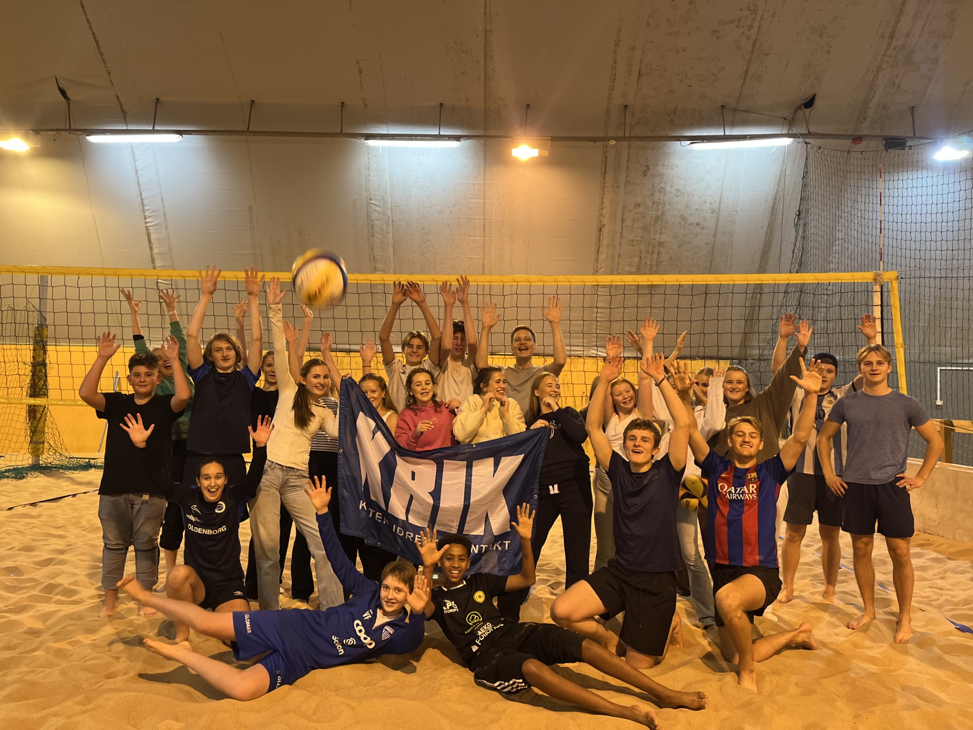 Bilde av to par ungdommer hvor hver av parene sitter på ryggen til hverandre og smiler stort. De står innendørs ved et volleyballnett