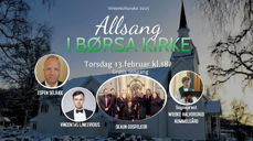 11.2.2025Det blir en allsangskveld i Børsa kirke onsdag 13. februar 2025 kl. 18.00.