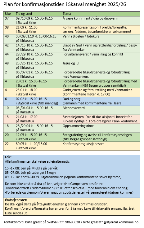 Timeplan for konfirmantundervisning i Skatval 2025-2026