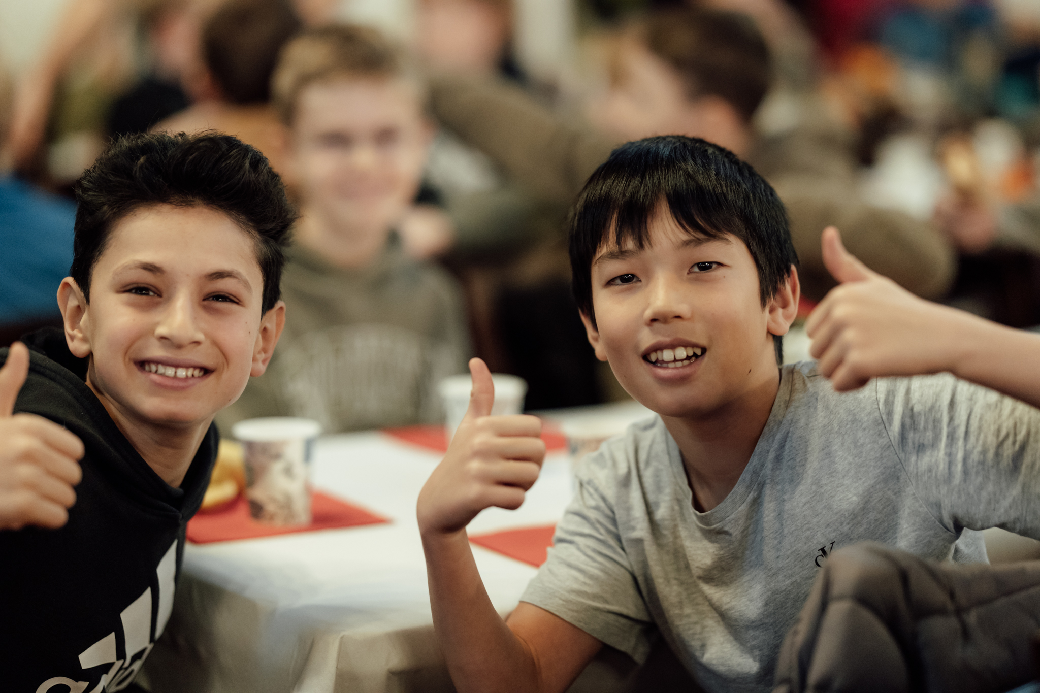 Elias og Mustafa ved Nyborg skole gir tommelen opp for Barnekonvensjonsdagen.