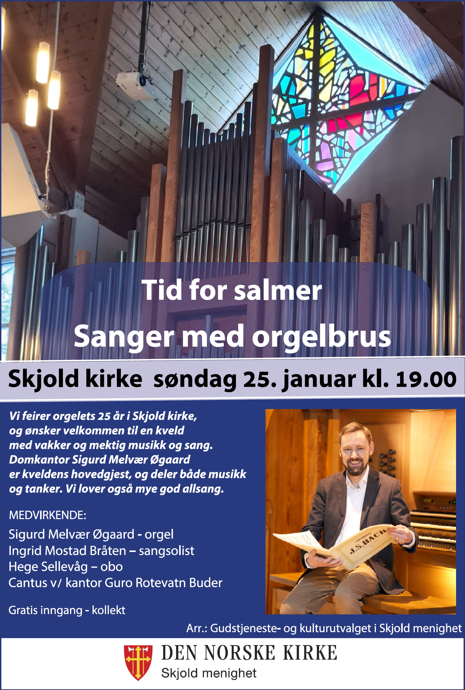 Vi feirer orgelets 25 år i Skjold kirke. Velkommen til Tid for salmer - Sanger med orgelbrus søndag 25. januar kl 19.00. Det blir en kveld med vakker og mektig musikk og sang. Domkantor Sigurd Melvær er kveldens hovedgjest, og deler både musikk og tanker. Vi lover også mye god allsang!