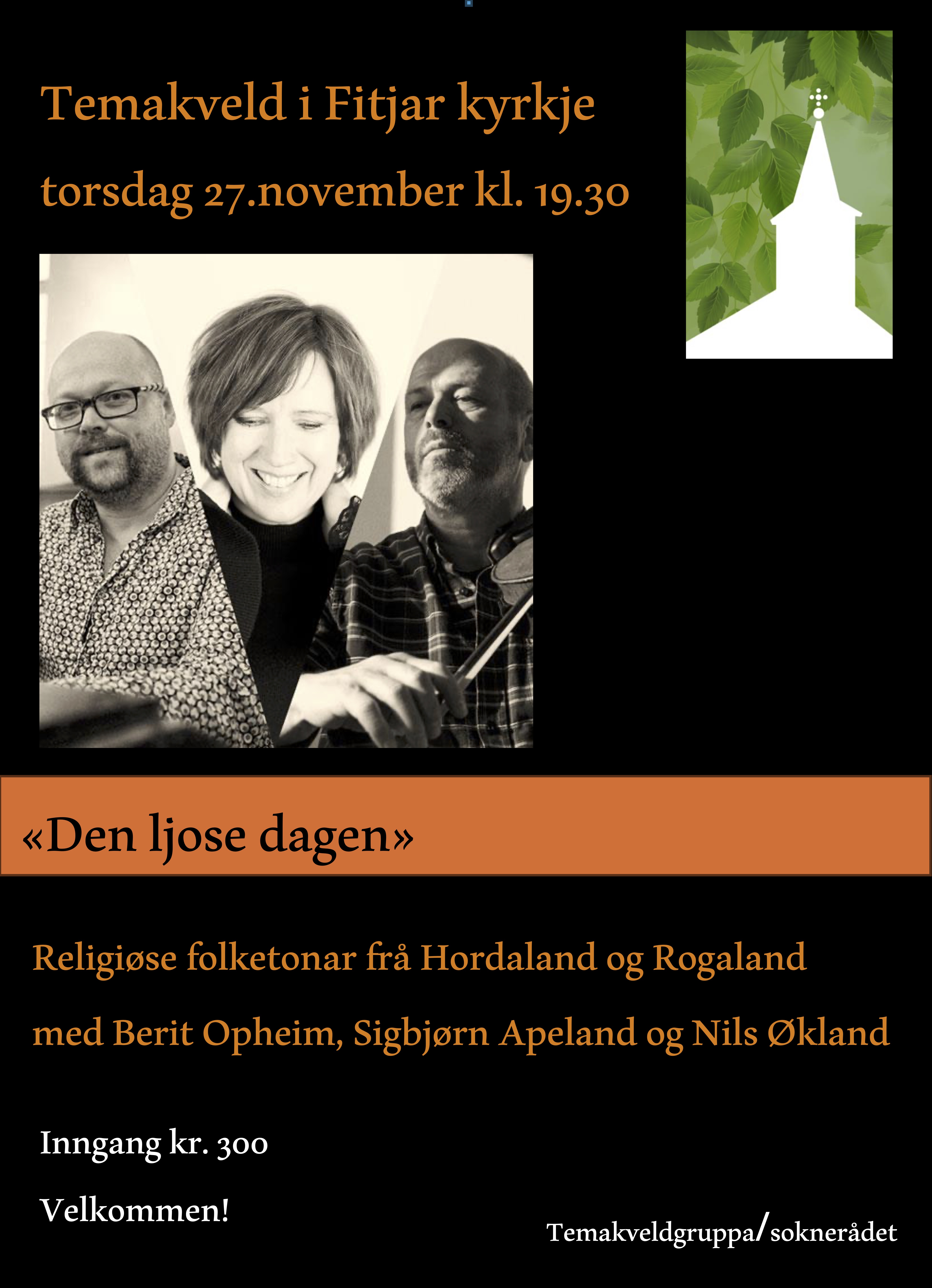 Det vert temakveld / konsert i Fitjar kyrkje, torsdag 27. november 2025 kl.19.30. "Den ljose dagen". Religiøse folketonar frå Hordaland og Rogaland med Berit Opheim. Sigbjørn Apeland og Nils Økland. Inngang kr. 300,-. Velkommen. Arr. temakveldgruppa.