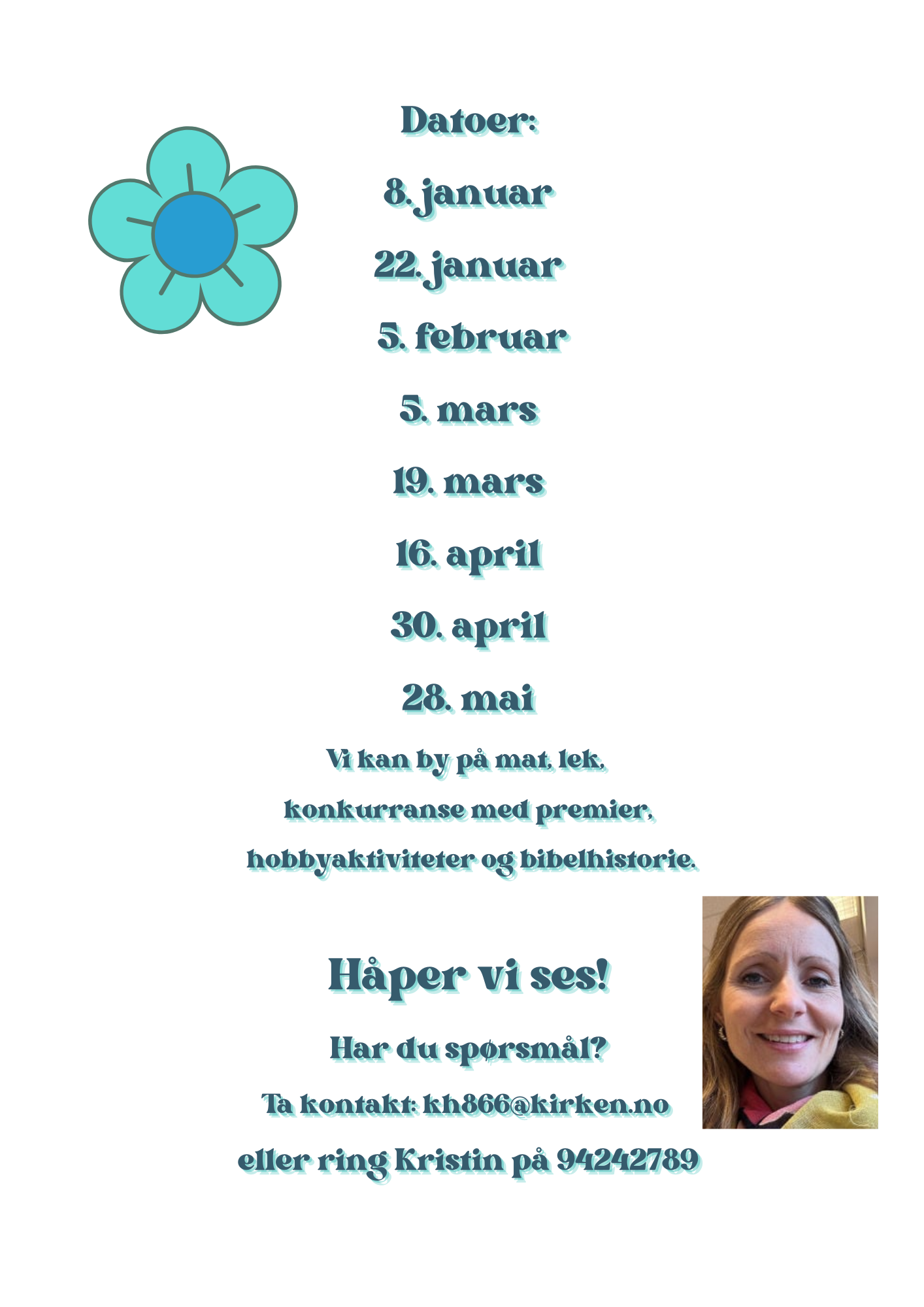 Vi møtes på Grøtvedt menighetssenter torsdager i partallsuker kl. 14.15 til 15.30.