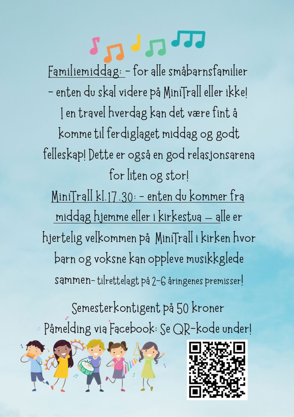 Det er semesterkontigent på 50 kr. Påmelding via Facebook ( se QR-kode ).