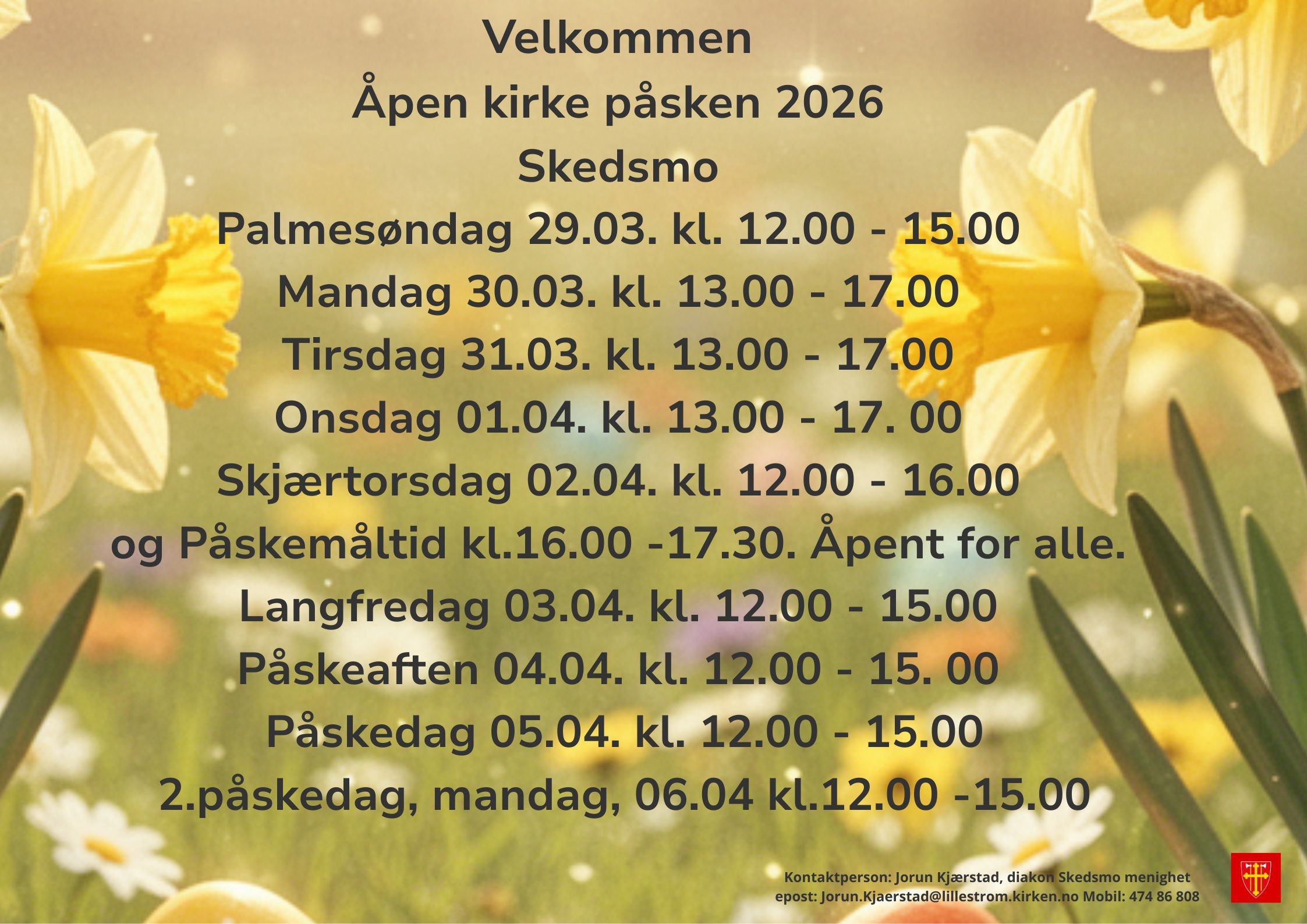 Skedsmo kirke er åpen hver dag hele påsken. Her kan man sitte ned i kirkebenkene i stillhet eller meditere, tenne lys, ta en kopp kaffe/te eller samtale med dem som har vakt. Alle aldersgrupper er velkommen!