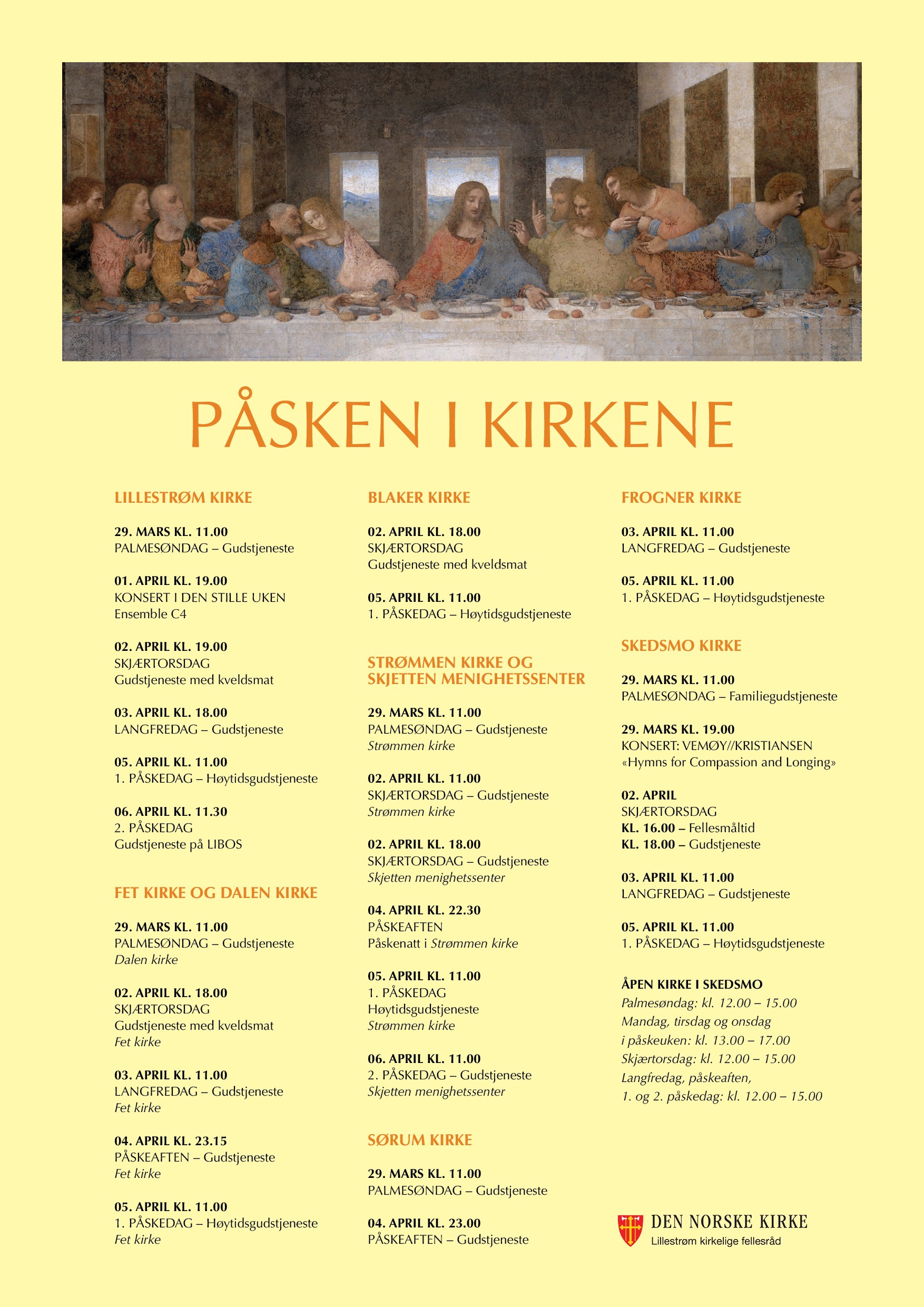 Velkommen til Lillestrøm-kirkene i påsken! Her finner du oversikt over alle gudstjenester, konserter og andre arrangement. Skedsmo kirke vil også være åpen i hele påskeuken.