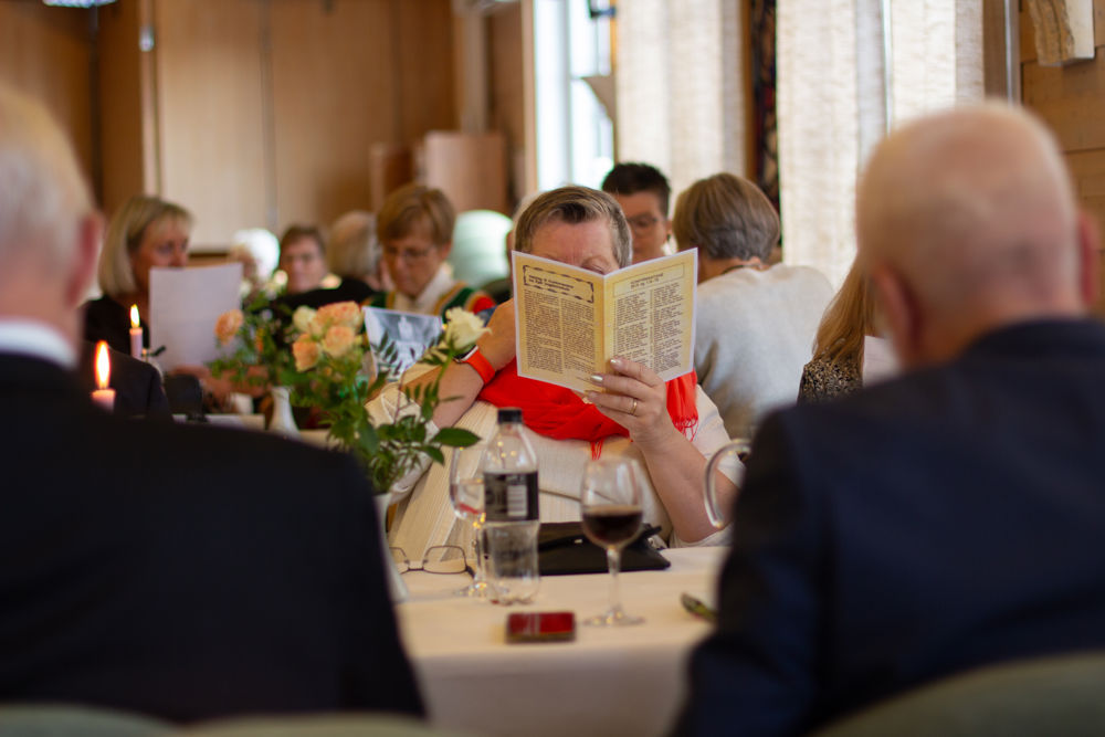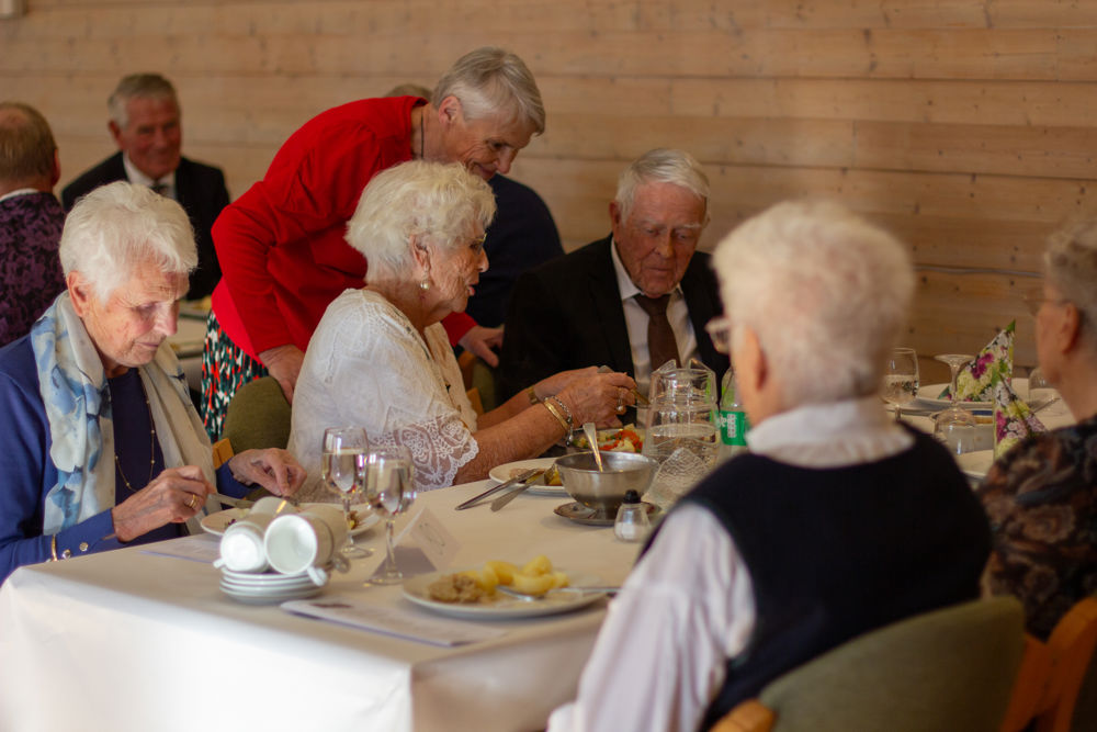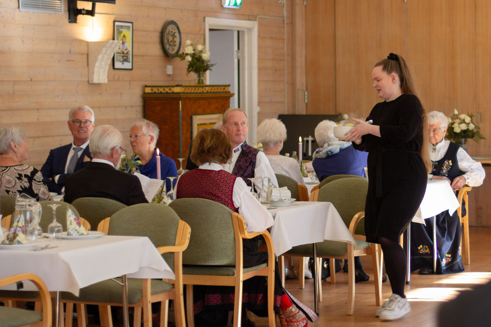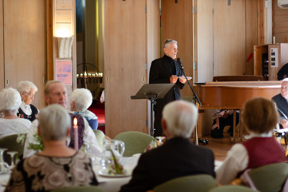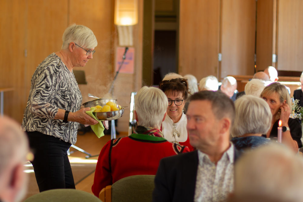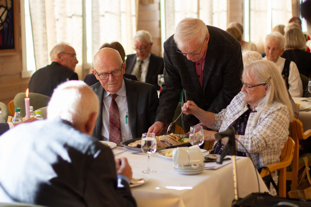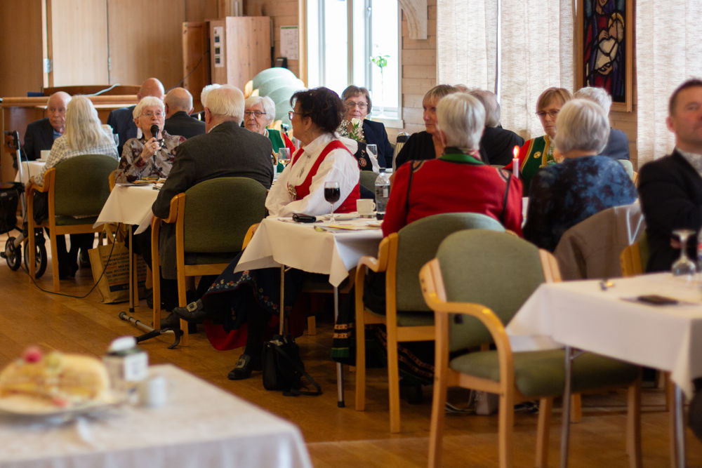 Der inne venta festpynta bord, og alle fekk servert middag med svinesteik og tilbehør. Sokneprest Per Hjemdal leia samlinga, og soknerådsleiar Eigil Nødtvedt kom med helsing og gratulasjonar til jubilantane.