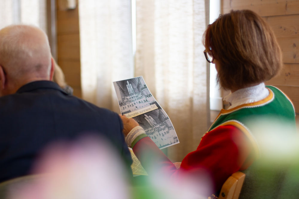 Innimellom vart det song, og fleire av dei som var til stades delte helsingar, dikt og små og morosame forteljingar frå tida si som konfirmantar. Ei kunne fortelle om ein konfirmanttime 1955 som hadde gjort særleg inntrykk, då presten forklarte symbola i kyrkja – søylene, treenigheten og stjernene – og korleis syn og høyrsel kunne vere med på å formidle.