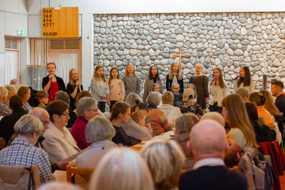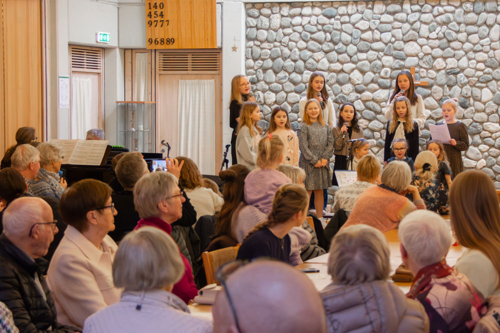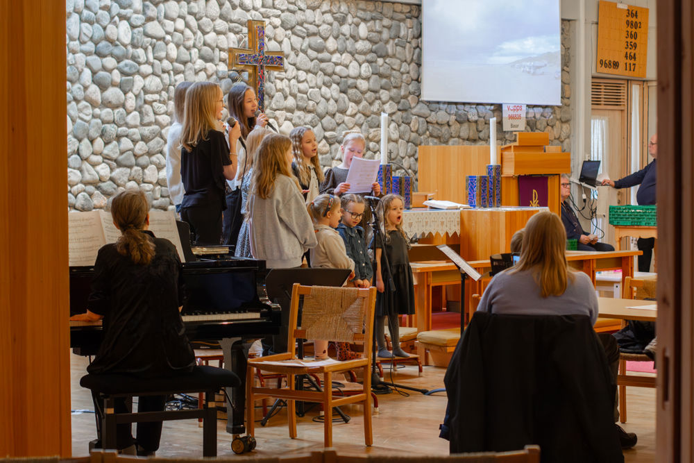 På den tredje songen fekk også publikum vere med og synge. Mot slutten vart salen delt opp i fleire grupper av kantor Eline, og songen vart avslutta i kanon. Det skapte både smil og god stemning i kyrkjerommet.